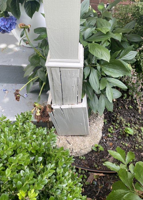 Many of these homes were built with wood columns meant for use inside homes, not outside! They are non-pressure-treated wood columns installed either directly in or too close to dirt. Over time, those bases absorb water, rot out, and lose structural integrity from the bottom up.